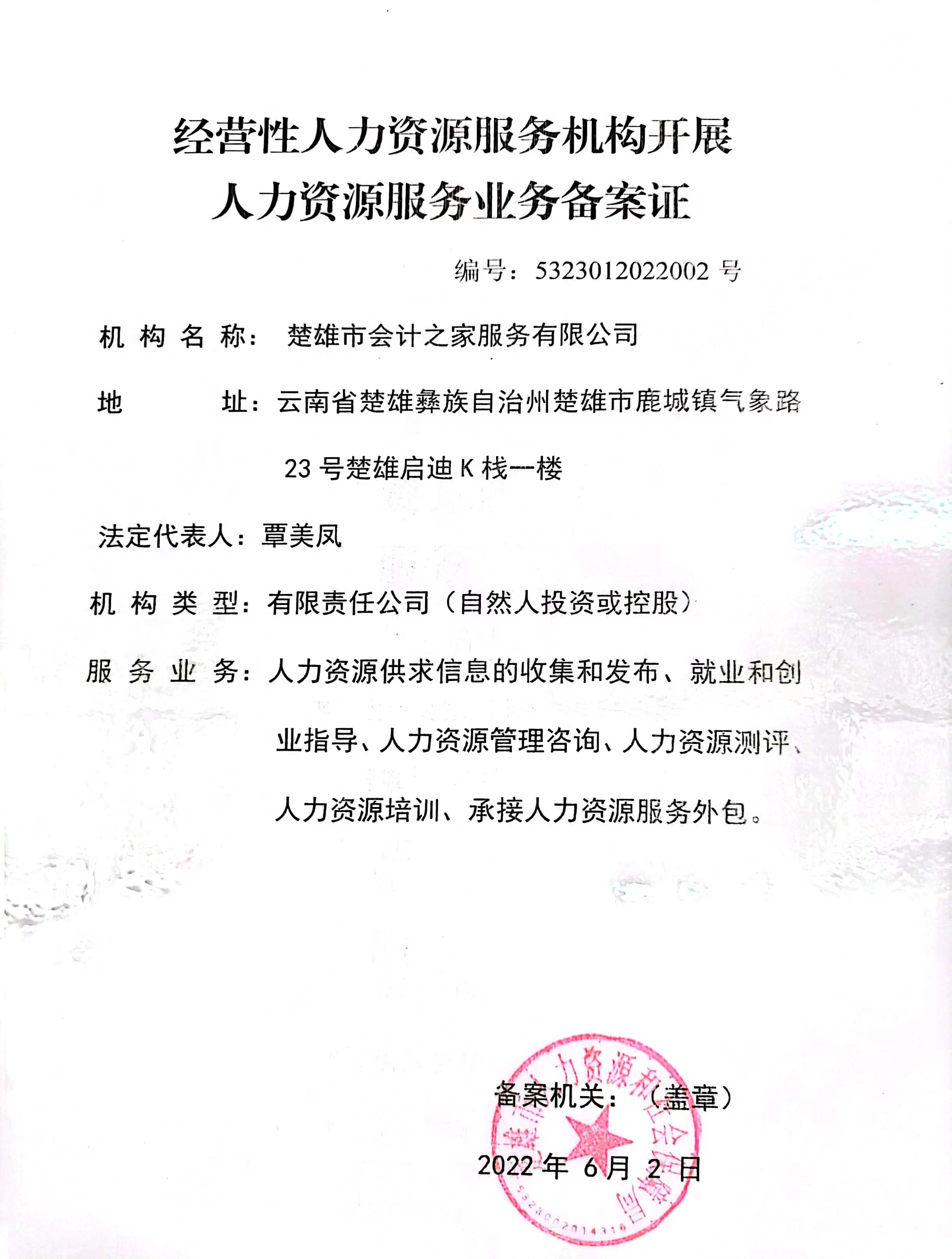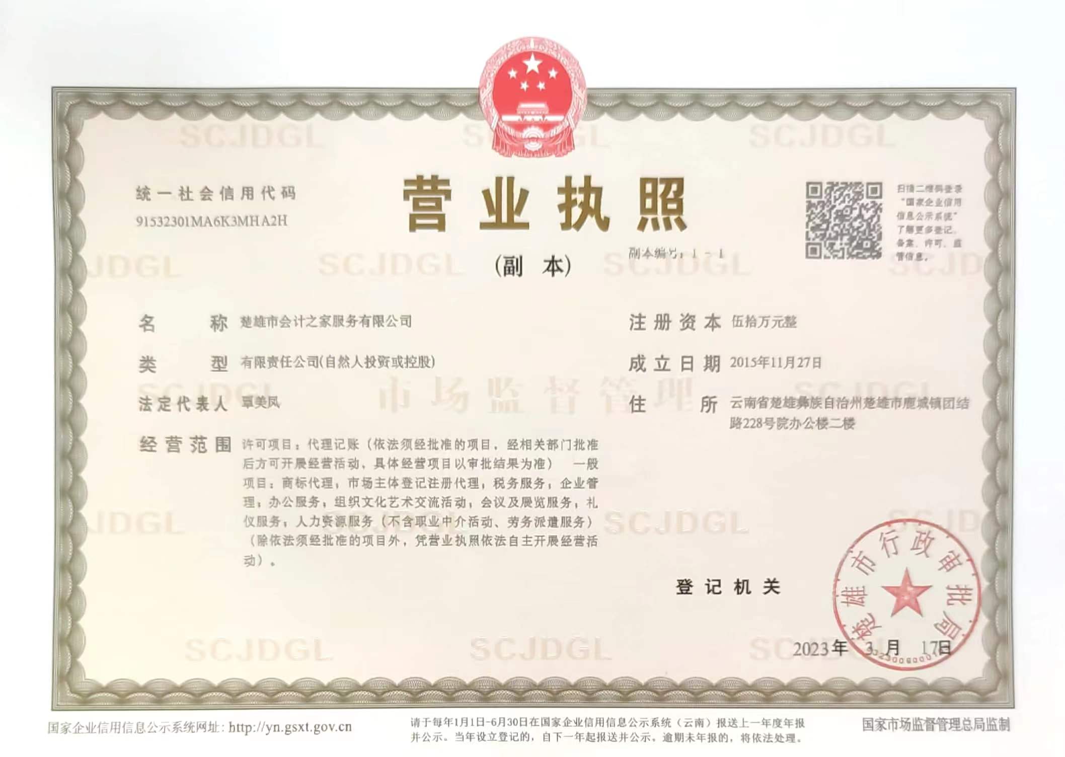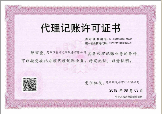 楚雄市会计之家服务有限公司是经楚雄市行政审批局批准成立的一家专业财税服务机构,公司主营经营工商服务、代理记账、财务外包、管理咨询、代办服务等业务。 机构不仅拥有多名有行业资历的专业人士,而且注重企业人才的培养与发掘;同时,经 过多年的积累与沉淀,不仅使得公司专业人士具备了高标准的专业知识,丰厚的实操经验以 及公司注册等业务处理得心应手,也使得公司成为专业代理企业。